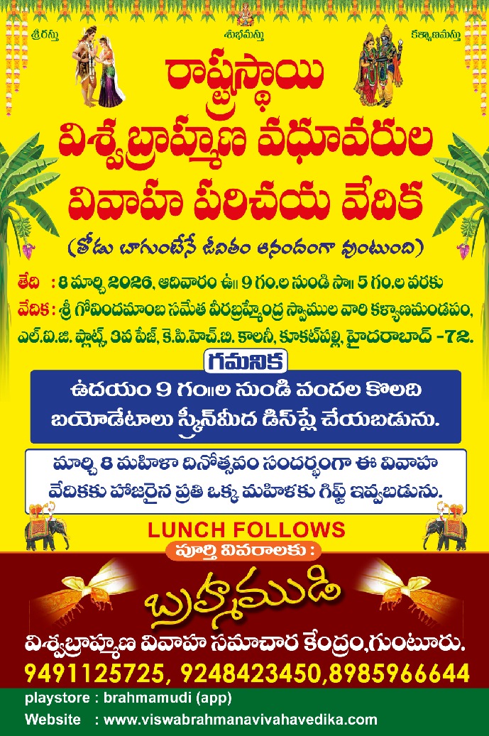 ముందుమాట :- 15 సంవత్సరాల కాలంగా నిర్వహిస్తున్న అనే సంస్థను మన సొంత సంస్థ అనుకొని అభిమానించి, ఆదరించి సలహాలు సూచనలు ఇస్తూ తెలుగు రాష్ట్రాలలోనే అగ్రగామి విశ్వబ్రాహ్మణ వివాహ వేదికగా నిలబెట్టినందుకు అందుకు సహకరించిన ప్రతి ఒక్కరికి హృదయపూర్వక ధన్యవాదాలు తెలియజేస్తూ...