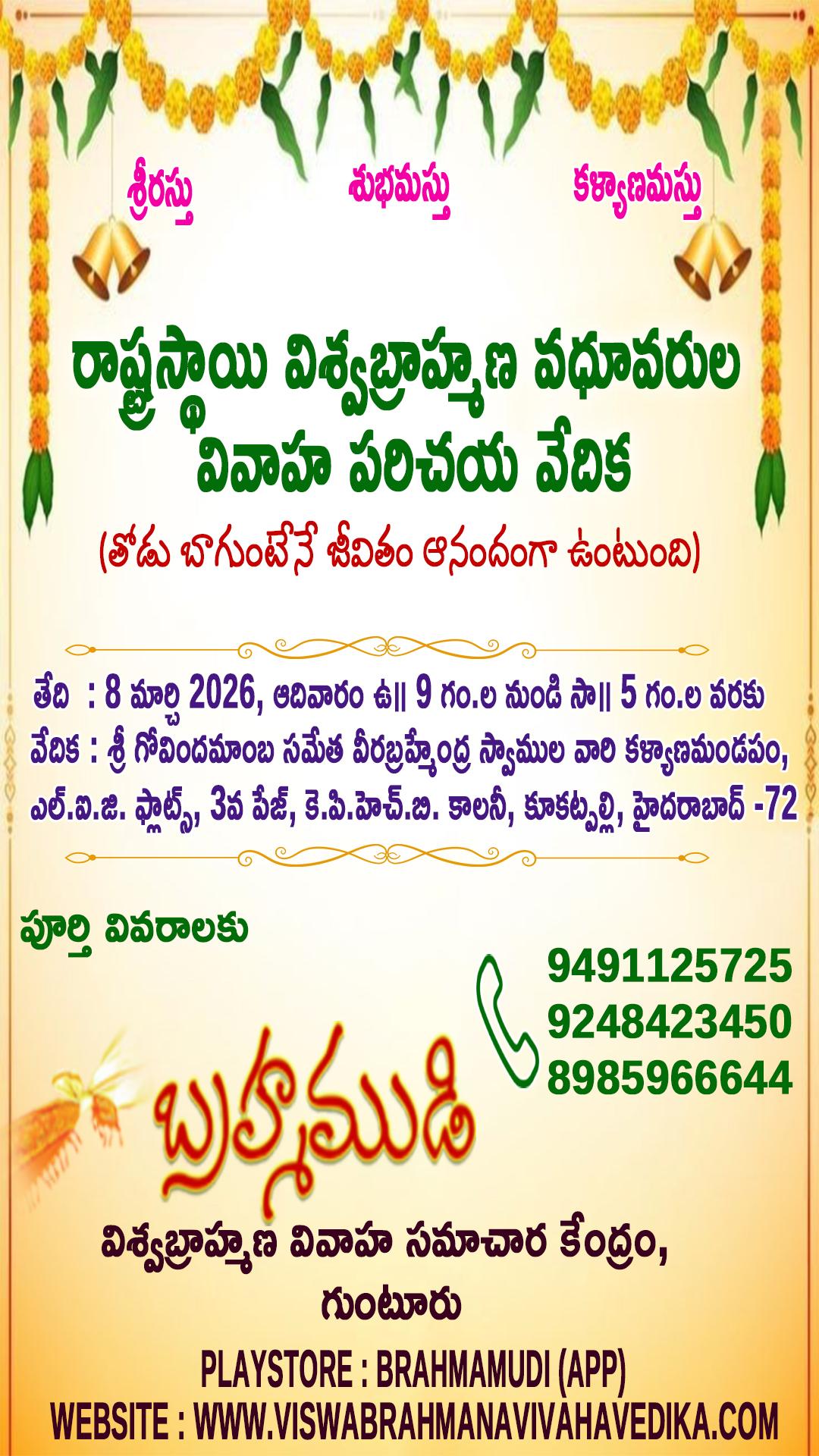 ముందుమాట :- 15 సంవత్సరాల కాలంగా నిర్వహిస్తున్న అనే సంస్థను మన సొంత సంస్థ అనుకొని అభిమానించి, ఆదరించి సలహాలు సూచనలు ఇస్తూ తెలుగు రాష్ట్రాలలోనే అగ్రగామి విశ్వబ్రాహ్మణ వివాహ వేదికగా నిలబెట్టినందుకు అందుకు సహకరించిన ప్రతి ఒక్కరికి హృదయపూర్వక ధన్యవాదాలు తెలియజేస్తూ...