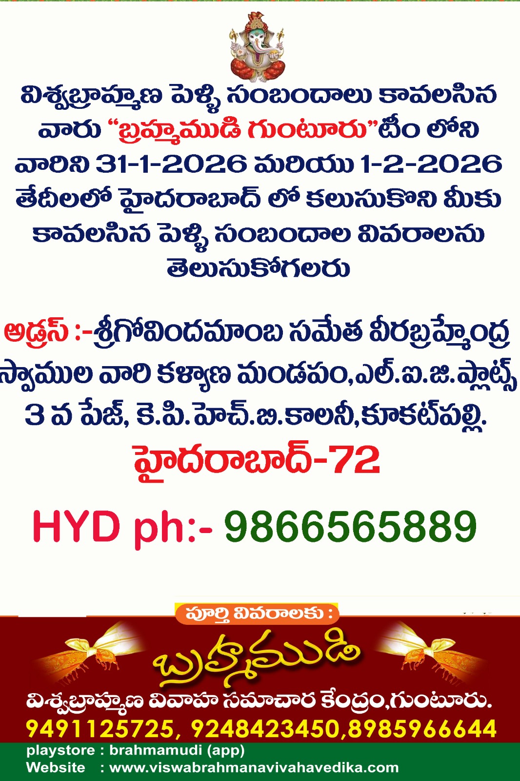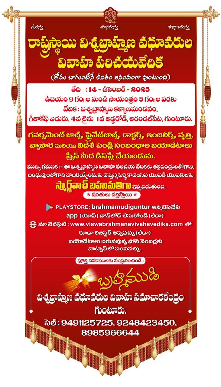 ముందుమాట :- 15 సంవత్సరాల కాలంగా నిర్వహిస్తున్న అనే సంస్థను మన సొంత సంస్థ అనుకొని అభిమానించి, ఆదరించి సలహాలు సూచనలు ఇస్తూ తెలుగు రాష్ట్రాలలోనే అగ్రగామి విశ్వబ్రాహ్మణ వివాహ వేదికగా నిలబెట్టినందుకు అందుకు సహకరించిన ప్రతి ఒక్కరికి హృదయపూర్వక ధన్యవాదాలు తెలియజేస్తూ...